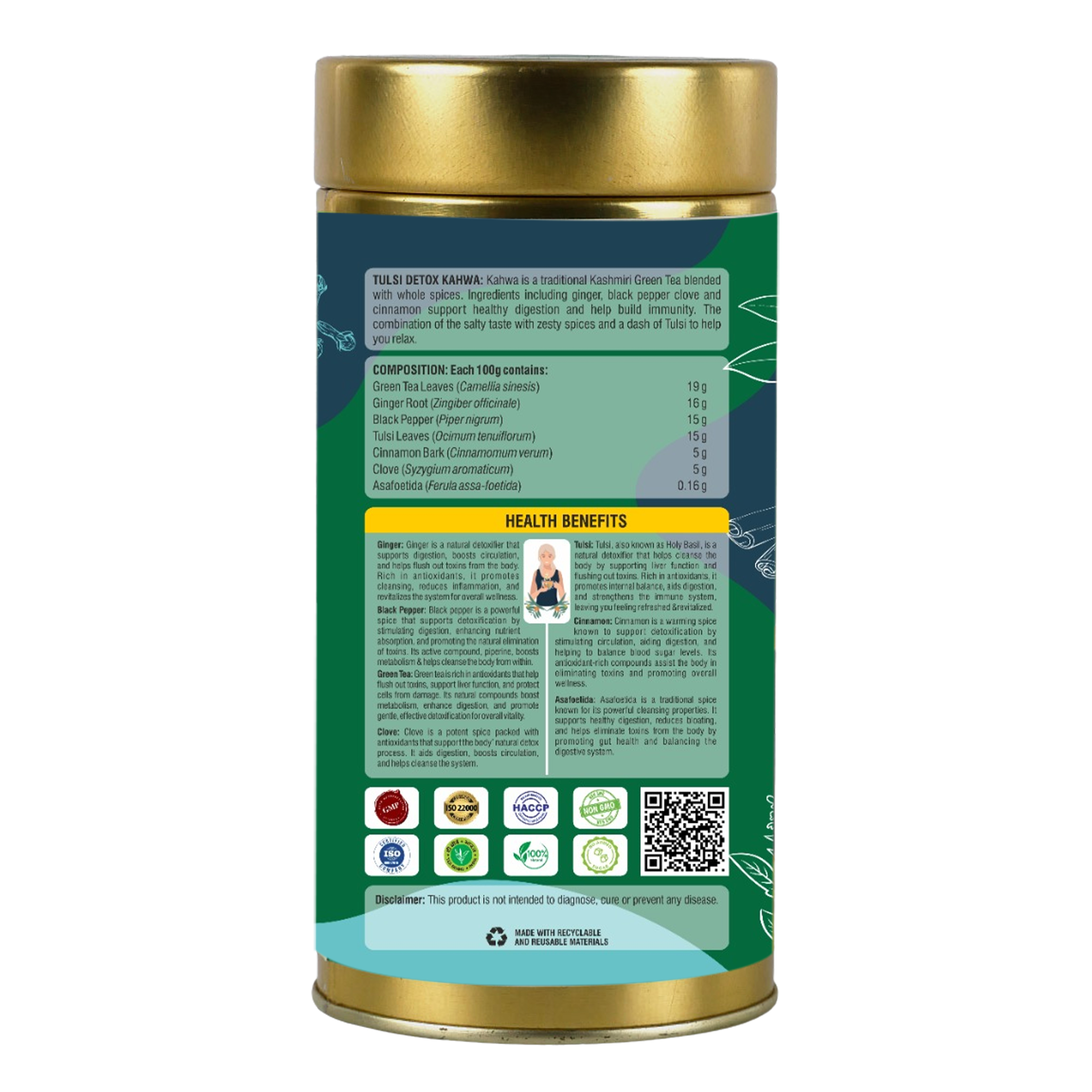Tulsi Detox Kahwa is a traditional herbal infusion crafted to support natural detoxification, immunity, and digestion. Made with the goodness of Tulsi leaves and complementary detox herbs, this caffeine-free kahwa helps cleanse the body, boost metabolism, and promote overall wellness.
